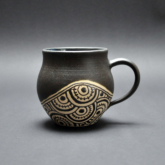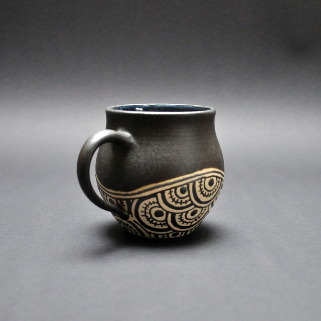 This stoneware piece is embellished with intricate quirky patterns. The mug's outer body is glazed with a beautiful matt black glaze and inside with a shiny blue (both glazes are self-made).