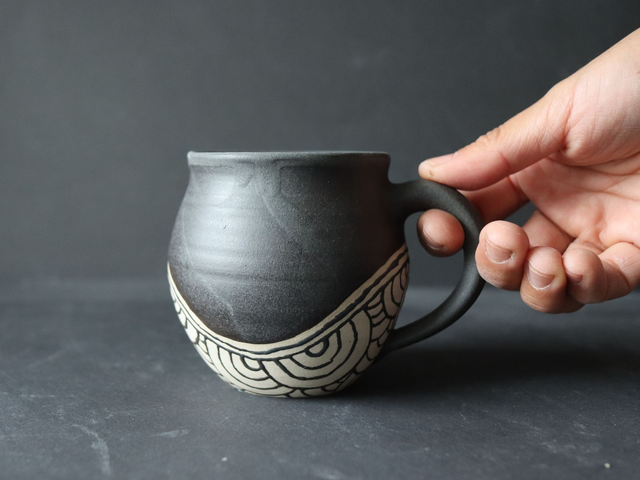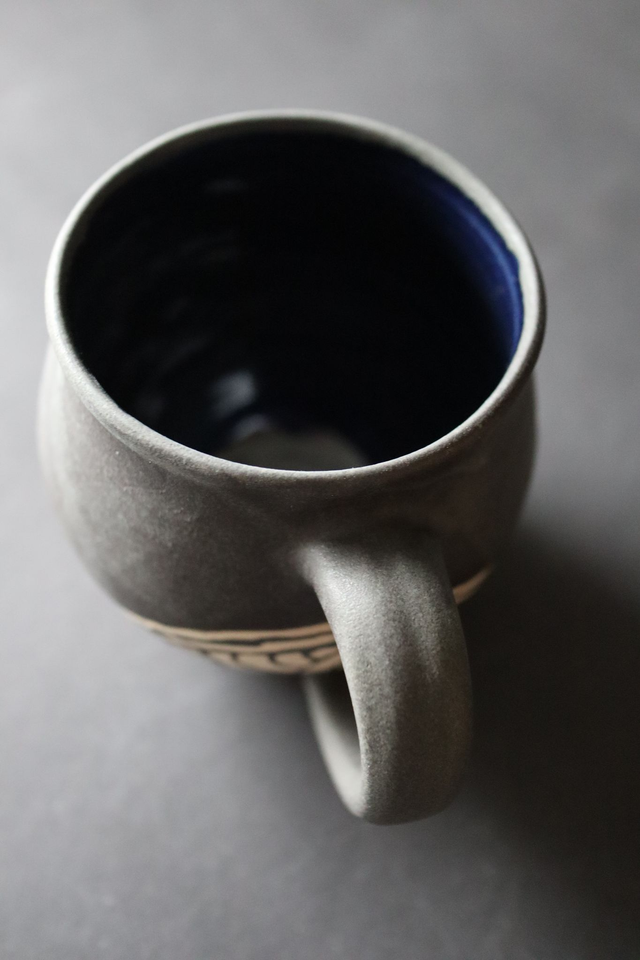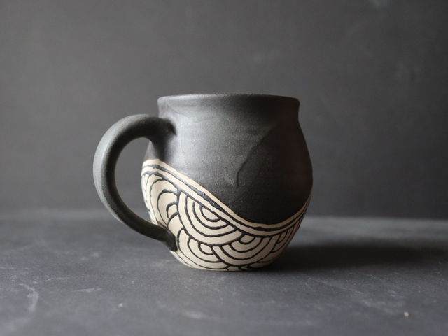This stoneware piece is embellished with hand-drawn wave patterns. The mug's outer body is glazed with a beautiful matt black glaze and inside with a shiny blue (both glazes are self-made).