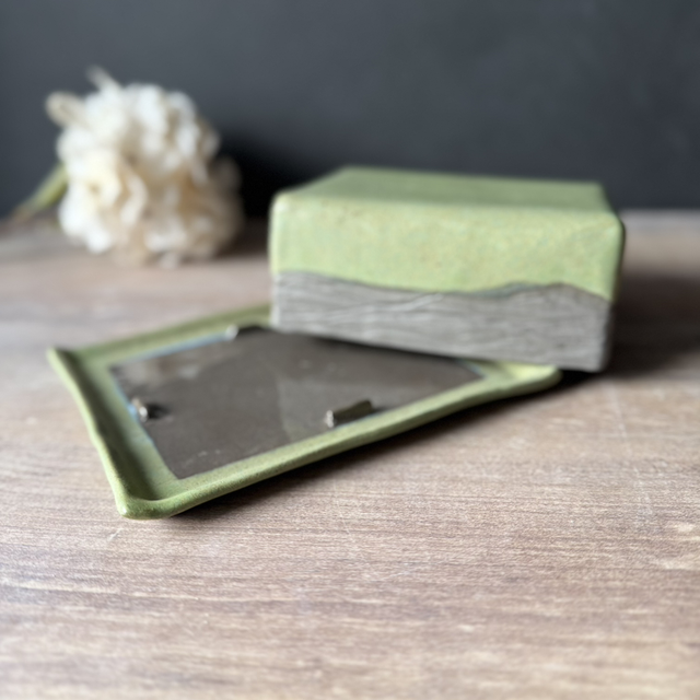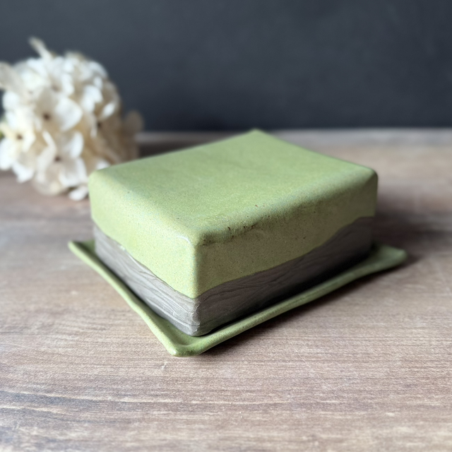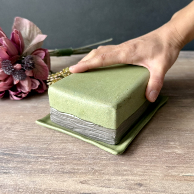 This is a handcrafted butter dish made by me (entirely slab-built) from my Woodland ceramic collection. The plate is finished with a transparent glossy glaze, while the rest is coated in my beautiful matte green glaze. The texture on the outside of the lid was hand-carved. It evokes nature—like a piece of the forest. The dish is suitable for both German and Irish butter sizes.