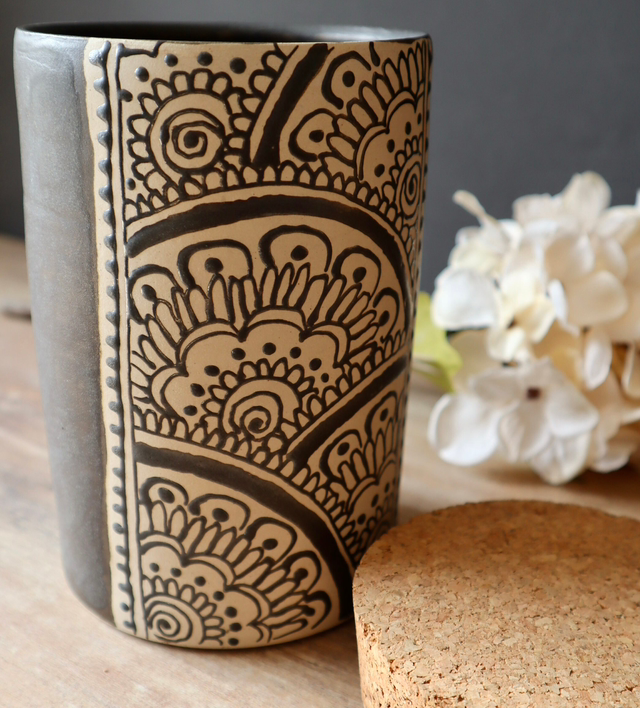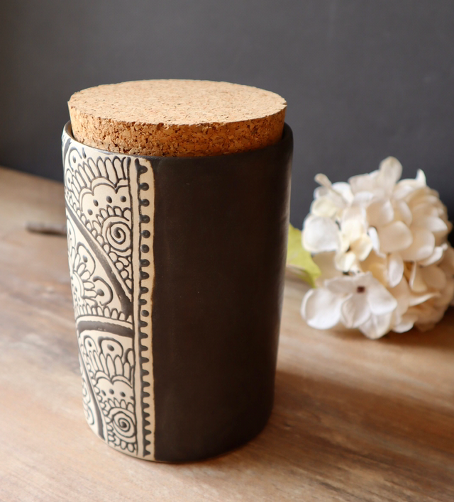 This is a wheelthrown stoneware jar with hand-drawn floral designs. It is glazed with my matt black glaze. It comes with a cork lid so that it can be used as a container. You can store espresso, coffee powder, flour, oatmeal etc. in it or also use it as a flower vase.