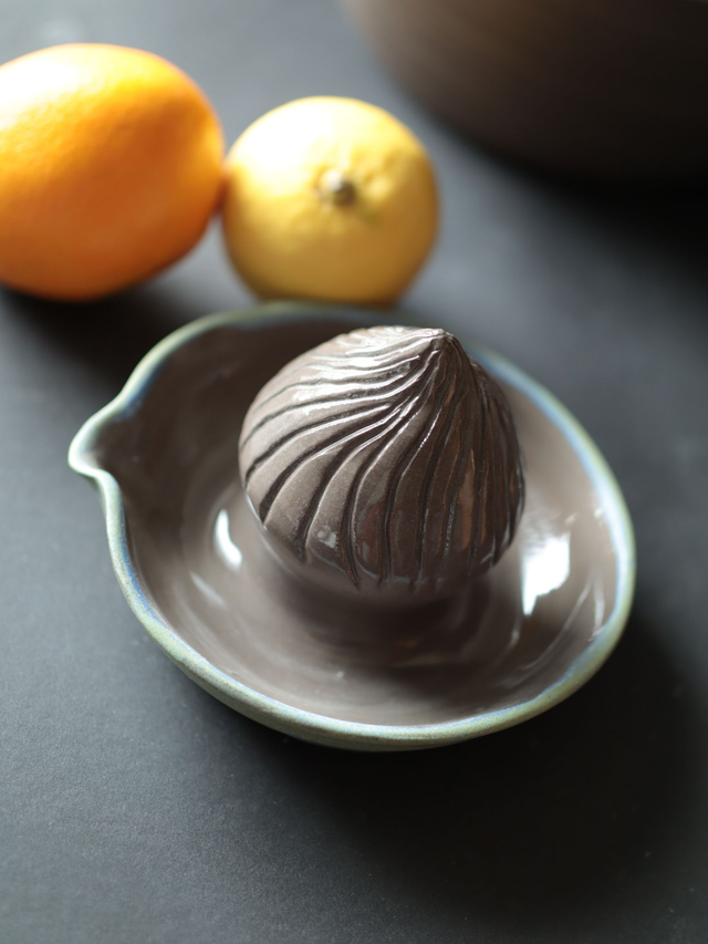 This is a wheel-thrown citrus press made from dark stoneware clay. There is a sprout where you can conveniently pour the juice out. The transparent glaze is acid-resistance and it's definitely a better alternative to plastic citrus juicers. The outside has been glazed with my beautiful matt forest green glaze (depending on the thickness of the glaze, the colors change slightly from dark green to light green to blue to yellow).