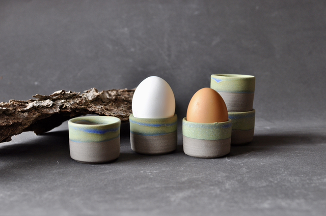 These are handmade eggcups made of dark brown/charcoal color stoneware clay. They are glazed with my beautiful matt green glaze (depending on the thickness of the application, the colors even change slightly from dark green to light green to blue to yellow). The exterior is partly left unglazed to accentuate the texture and nature of the ceramic. And of course - you can also use them as shot glasses!