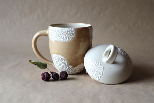 This handmade mug has a beautiful lid which will keep your drinks nice and hot. This stoneware piece is embellished with hand drawn joyful flowers. The mug's outer body is glazed with a romantic peach color glaze and inside with white. The lid is also white.
