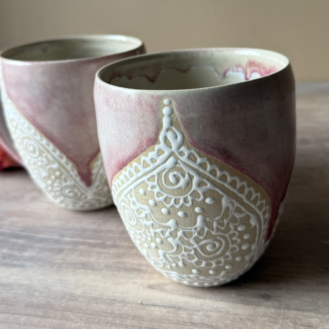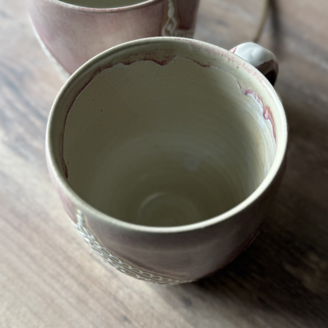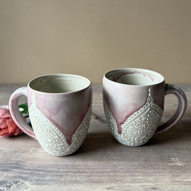 Romantic Pink Large Mug with White Patterns, handmade stoneware, Art Piece