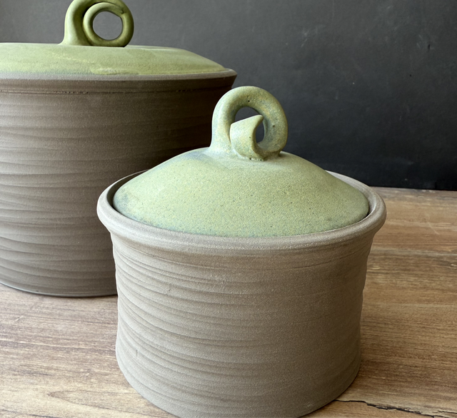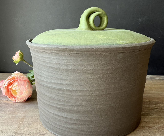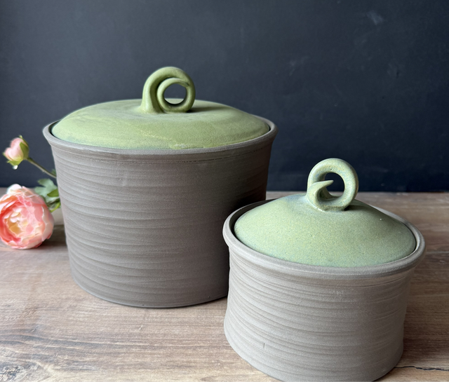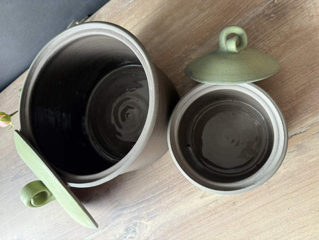 These are handcrafted ceramic jars with lid made from dark stoneware clay. The pots are glazed inside so you can store liquid as well and dry goods in it. It is dishwasher-safe and does not absorb any odours. The lid was glazed with my matte green glaze. (Depending on the thickness of the glaze, the colors change slightly from dark green to light green to blue to yellow).